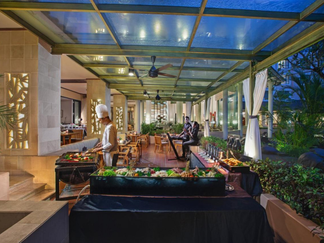 L'établissement compte le restaurant Prana et le restaurant en bord de mer Amertha. Tous deux sont ouverts toute la journée et servent des spécialités locales et internationales. En outre, un service d'étage est assuré.